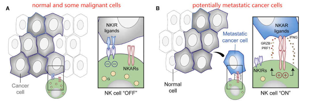 现有研究已证明了NK细胞在控制血液恶性肿瘤,包括多种类型的白血病和淋巴瘤中发挥的重要作用,而NK细胞在限制原发性实体瘤生长方面的生理作用仍然是一个需要探讨的问题,不过其在控制癌转移过程中的关键作用已得到广泛认可。临床研究发现在特定癌症类型中,如胃肠道间质瘤、胃癌、结直肠癌、肾癌和前列腺癌,患者体内循环或肿瘤浸润的NK细胞数量与临床转移灶的出现存在显著的负相关性。癌症患者的持续预后也与NK细胞的激活受体(NKAR)高水平的表达或其细胞毒性的增强密切相关。NK细胞的细胞杀伤活性是顺利获得NK细胞表面的多种抑制性受体NKIRs和激活性受体NKARs共同介导,当抑制性受体KIRs与正常细胞及部分癌细胞表面表达的主要组织相容性复合体I(MHC I)分子相互作用时,NK细胞保持效应功能的抑制,不产生杀伤活性。而当细胞受损或感染时,其表面特异性NKAR的配体上调,如MICA、MICB和ULBPs,从而被NK细胞激活性受体NKG2D识别,促进NK细胞杀伤活性。在NK细胞抑制癌转移过程中,NK细胞对转移性黑色素瘤细胞的有效杀伤能力,也归因于癌细胞表面能够被NKAR(NKp44、NKp46和DNAM-1)识别的配体的过度表达。此外,NK细胞识别和清除癌转移细胞的能力同样得益于肿瘤微环境中上皮-间质转化(EMT)细胞中NKG2D配体的上调以及NKIR配体如E-cadherin的丢失,当激活性信号占优势时,NK细胞被激活,并顺利获得释放穿孔素和颗粒酶、分泌干扰素-γ(IFN-γ)以及表达死亡受体配体FASL等方式发挥其杀伤能力,抑制癌细胞转移(图1)。