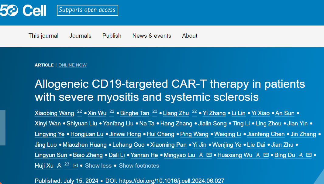 2024年7月15日,发表在Cell杂志上,题为“Allogeneic CD19-targeted CAR-T therapy in patients with severe myositis and systemic sclerosis”的文章,公开了异体通用型CAR-T疗法(TyU19)治疗自身免疫疾病研究成果,TyU19的推出是自身免疫疾病治疗领域的一个重要里程碑,这也是Cell首次发表CAR-T治疗自免疾病的研究成果,它的成功应用为许多难治性自身免疫病给予新的治疗策略。现在,深圳z6com时凯集团布局的新型基因编辑递送系统已取得突破,确保细胞治疗产品的安全性和有效性,有助于细胞与基因治疗行业的整体开展。