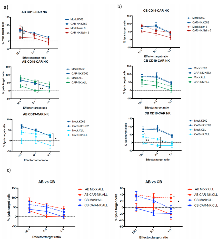 本研究检测了两种来源的非转导NK细胞和CD19 CAR-NK细胞在不同效应靶比下的细胞毒性活性。AB和CB CAR-NK细胞比未转导的NK细胞更好地裂解表达CD19的靶细胞。AB CD19 CAR-NK细胞在10:1比例杀伤Nalm-6的能力、10:1和5:1比例杀伤ALL的能力、1:1比例杀伤CLL细胞的能力显著优于CB CD19-CAR NK细胞。另一方面,在10:1和5:1的比例下,CB CD19-CAR NK细胞裂解CLL细胞的能力显著增强。总结:不管是对ALL还是CLL原代患者肿瘤细胞,AB来源CD19-CAR NK细胞杀伤能力明显优于CB来源。