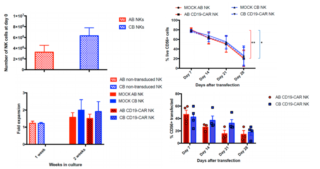 顺利获得阴性选择从AB或CB PBMC中分离出NK细胞,结果显示,从CB中分离得到的NK细胞多于从AB中分离得到的细胞。两周后在CB NK细胞中观察到略高的倍数扩增,但扩增倍数也较低,2周仅扩增2-3倍。 病毒转导后,细胞存活率都随着时间的推移而下降,到第 28天,两种细胞来源的CAR-NK存活率都显著下降到20%左右。在转导效率方面,AB CAR-NK平均转导效率为47.46%,而CB CAR-NK 转导效率为 46.8%。AB和CB NK细胞的转导效率之间没有发现统计学差异。不管是AB还是CB来源的NK细胞制备的CAR-NK,深圳z6com时凯集团制备活率和纯度均在90%以上,CAR转导阳性率高达60~80%,扩增倍数可达上万倍。